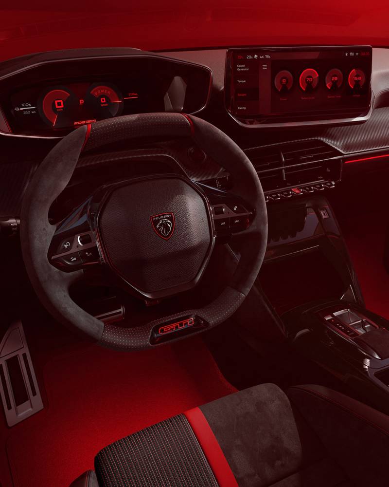 The illuminated PEUGEOT GTi badge lights up the front grille, the Lion emblem glows with red accents, and every surface reflects its performance spirit.
